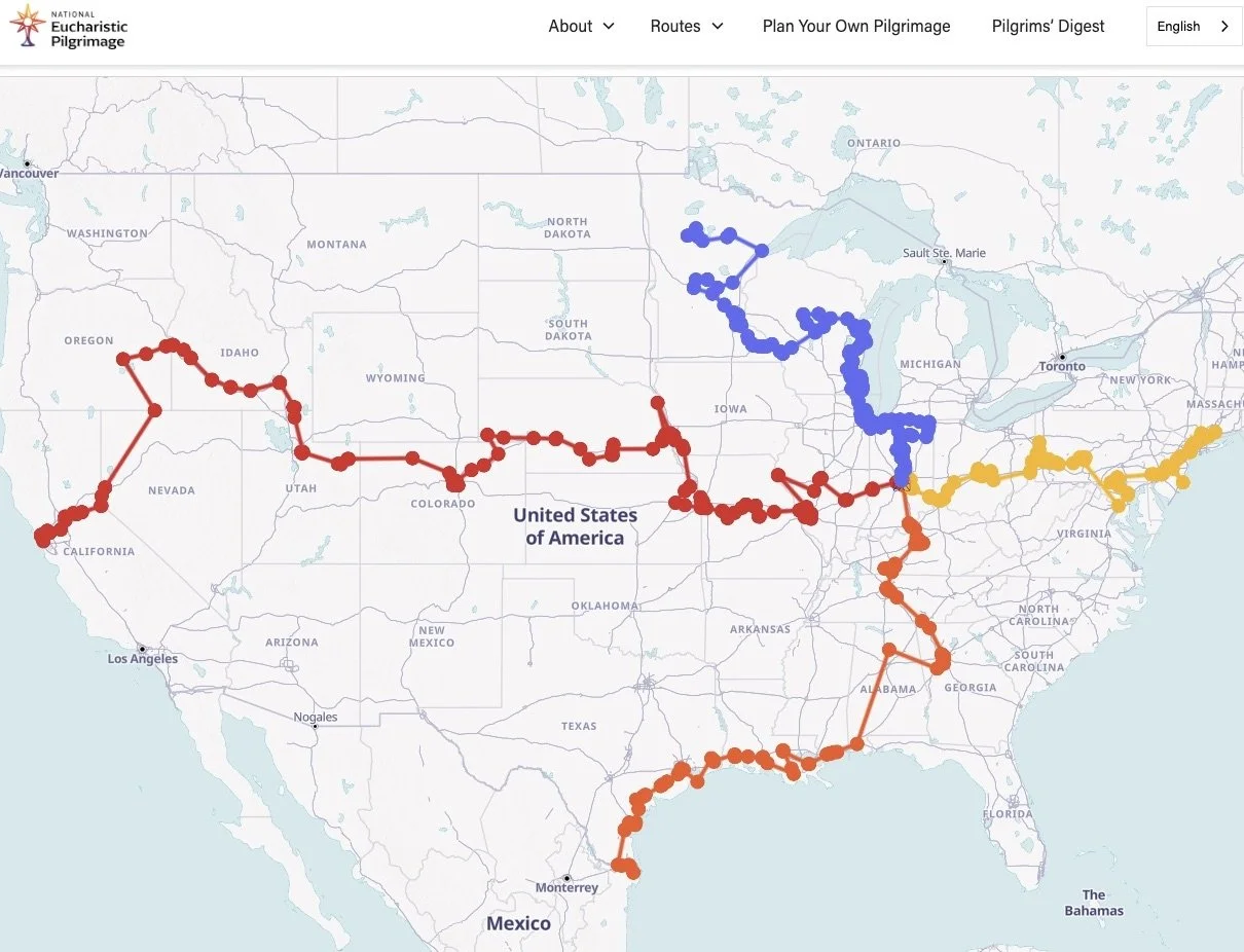 As you examine the cross-shaped path across our country, notice the four separate journeys, all converging in Indy. These four routes represent the National Eucharistic Pilgrimage (May 17 - July 16), which ends in Indy as the National Eucharistic Congress commences on July 17 through July 21.